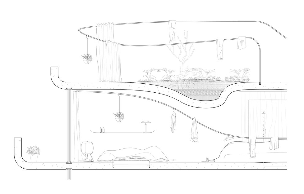 Static moment is abrupt by the dynamic movement of curtains, The center of domesticity has no absolute boundary, and is subject to merge with other space.